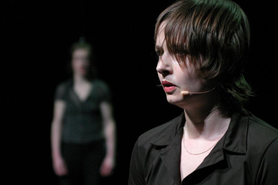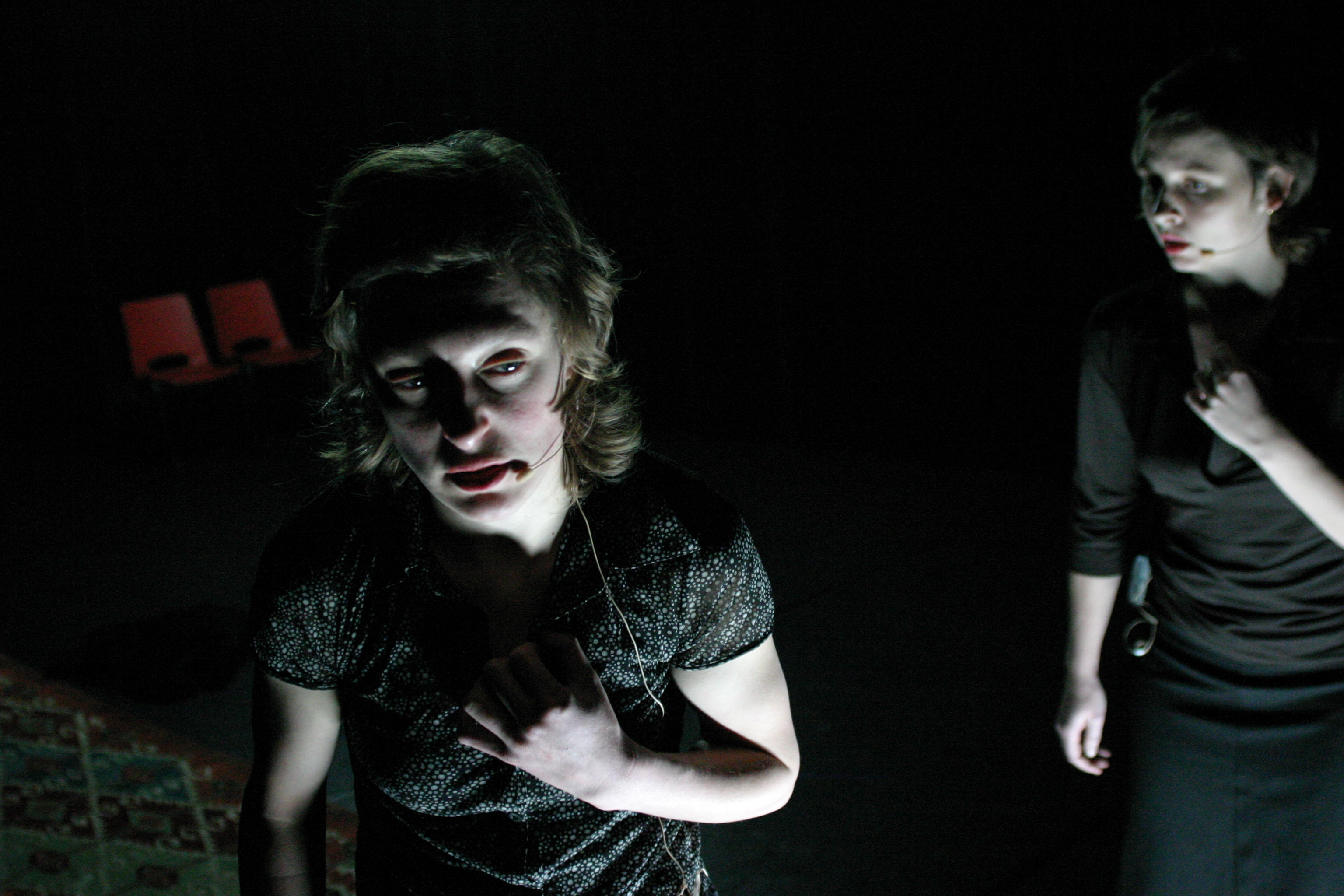 Strikingly enough, the stage itself is anything but claustrophobic. It is almost bare: four chairs, a rug, an undefinable piece of black cloth and a string that turns on the light. Two female silhouettes (Hester van Hasselt and Esther Snelder) are standing near the front of the stage, their faces obscured by the backlighting (the lighting design is by Minna Tikkainen). Snelder starts talking: ‘We’re stuck. We’re stuck now. We are stuck’. The relentless repeating of these words, coupled with Van Hasselt’s whisperings – ‘you have to go left…through the glass door’ – had an oppressive effect on me, as if I were stuck in their loop with them. Forever and ever and ever.